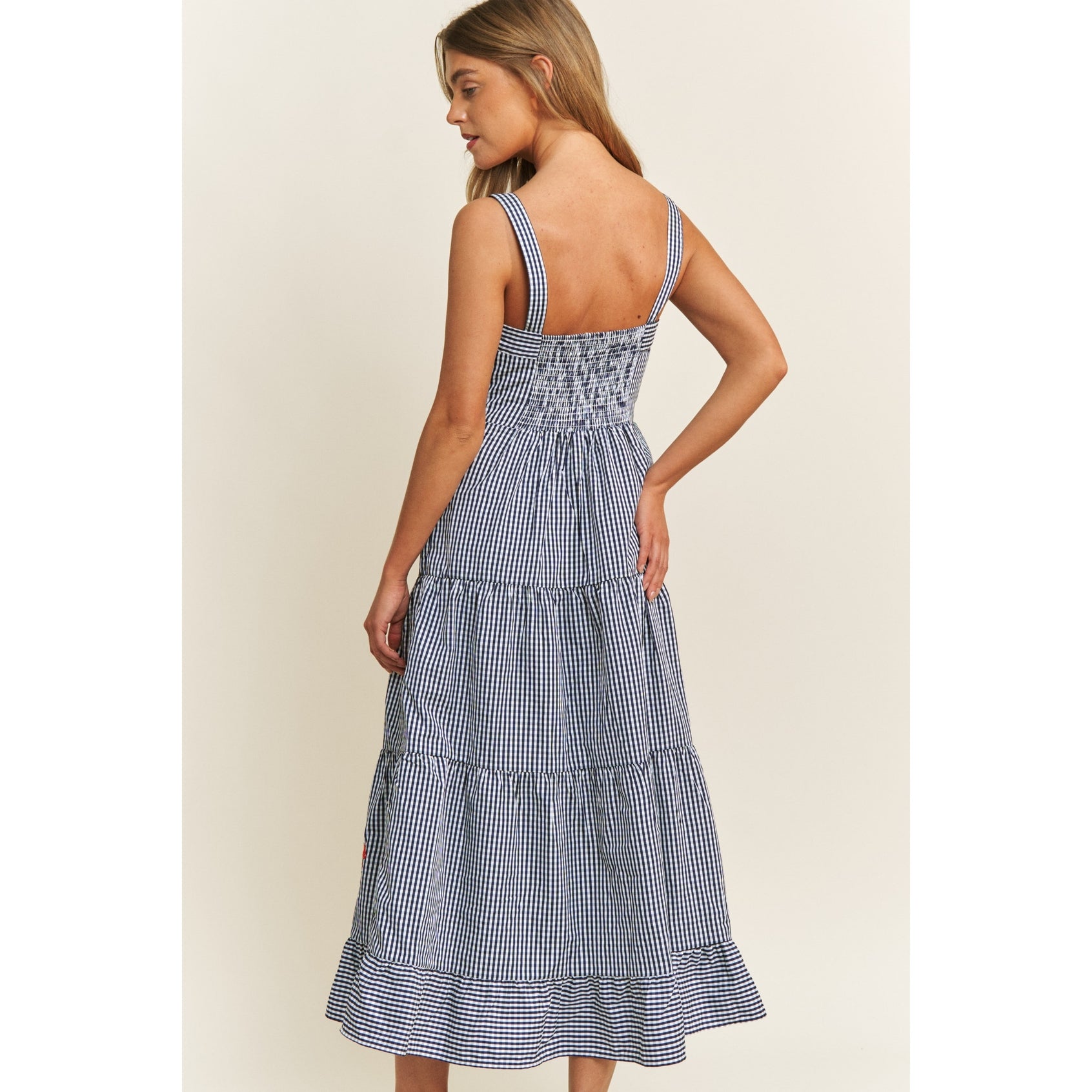 Sweet, coastal, and effortlessly flattering, this tiered gingham dress is designed for sunny days and seaside moments. Crafted from soft woven gingham fabric, it features a charming lobster embroidery detail for a playful Cape Cod touch. The fit-and-flare silhouette creates an easy, feminine shape, while wide shoulder straps offer all-day comfort. A smocked back bust band allows for an adjustable fit, and the hidden side-seam zipper keeps the look clean and polished. Perfect for beach days, summer events, and everything in between.