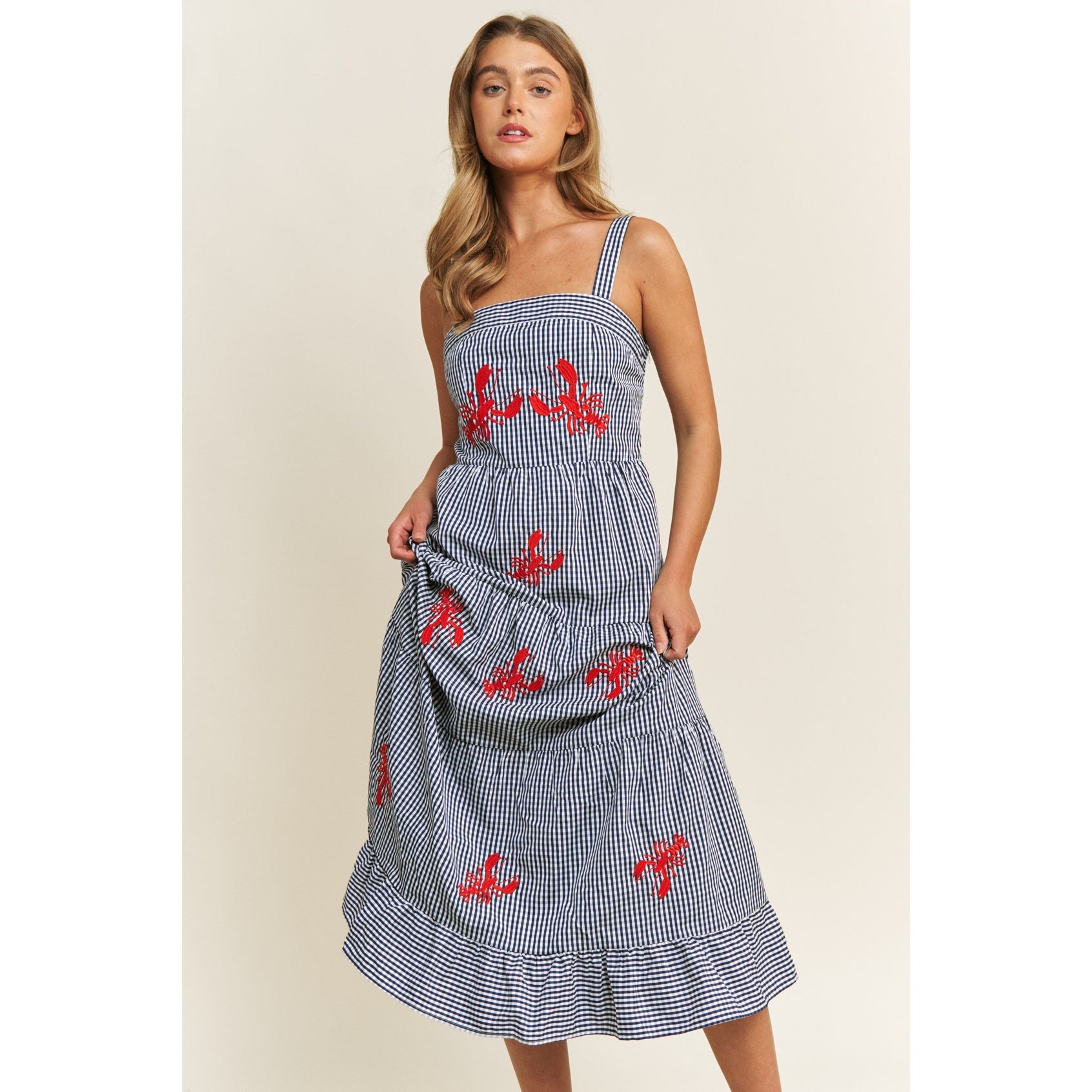 Details: • Soft gingham woven fabric • Lobster embroidery on front • Tiered silhouette • Wide shoulder straps • Smocked bust band on back for adjustable fit • Side-seam invisible zipper • Flattering fit-and-flare shape