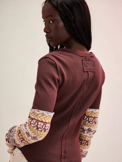 Features: Soft cotton fabrication with a textured feel, long-sleeves with exaggerated mixed print cuffs, thumbhole detailing, exposed seams throughout