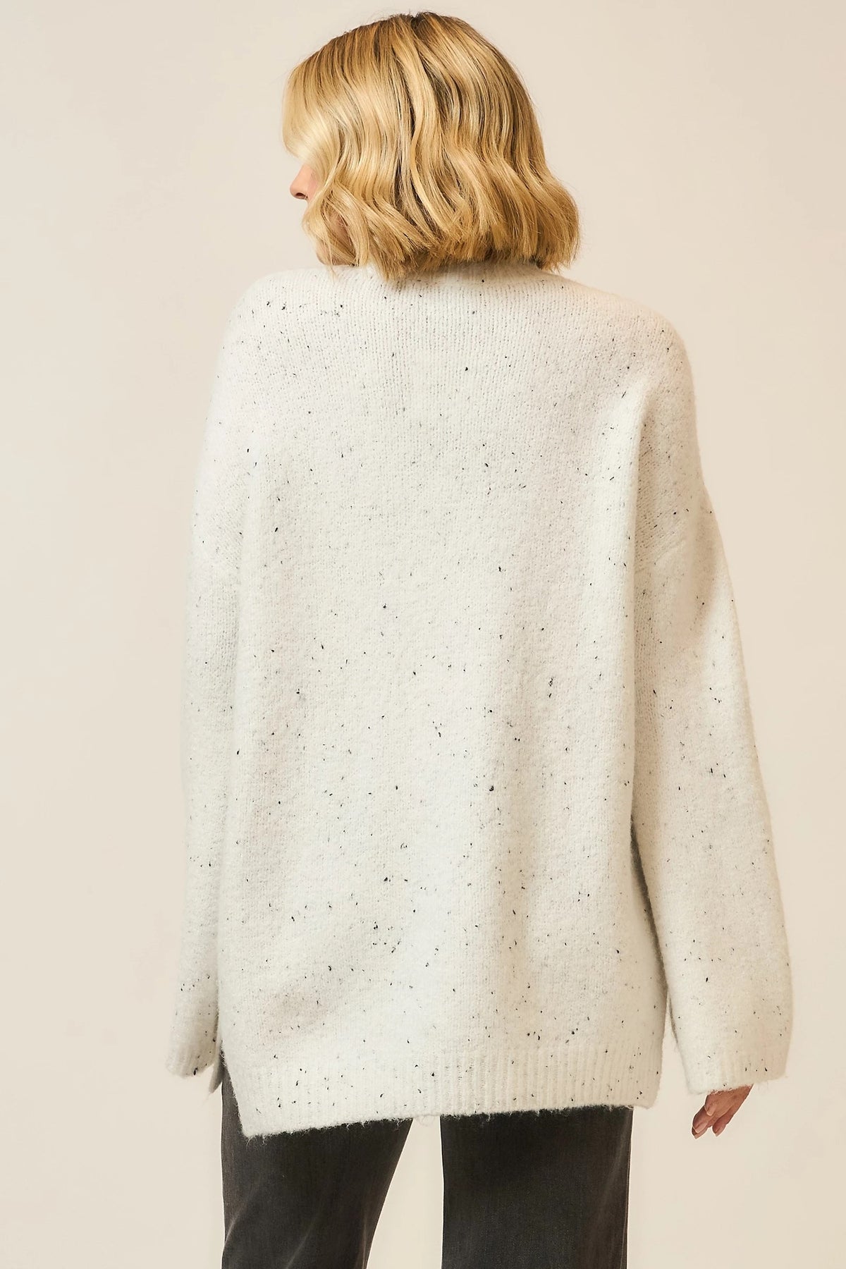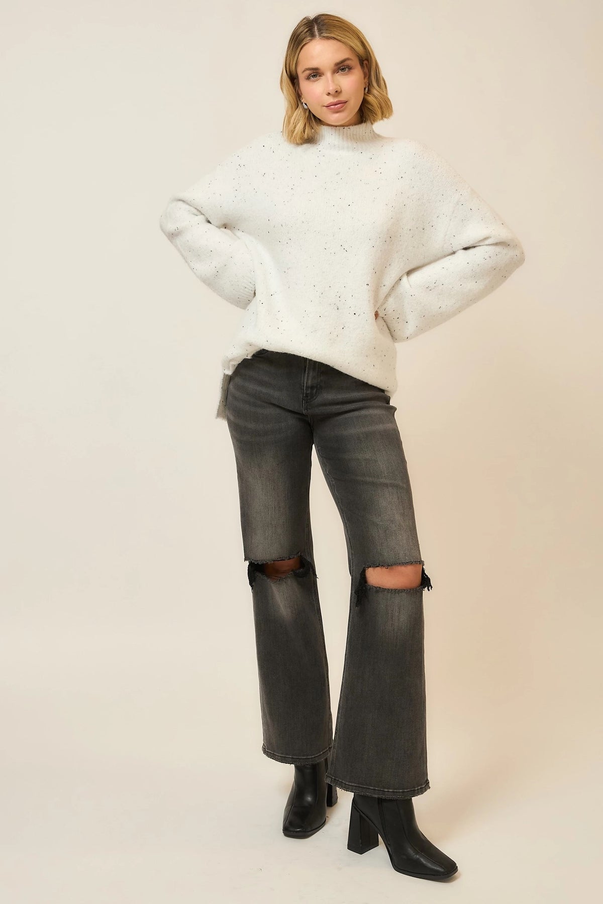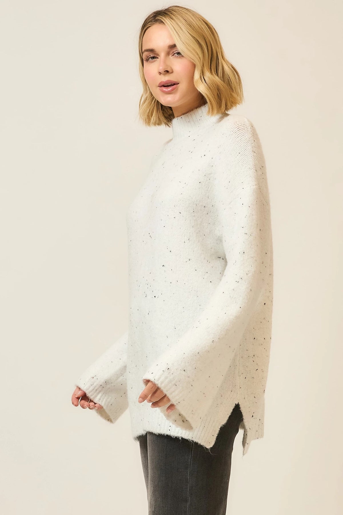 Cozy vibes meet style with this sweater's plush texture and charming bell sleeves. The mock neck adds a touch of sophistication, while the speckled yarn gives it personality and visual interest. Perfect for layering or wearing solo, this piece brings comfort and flair to your everyday rotation.