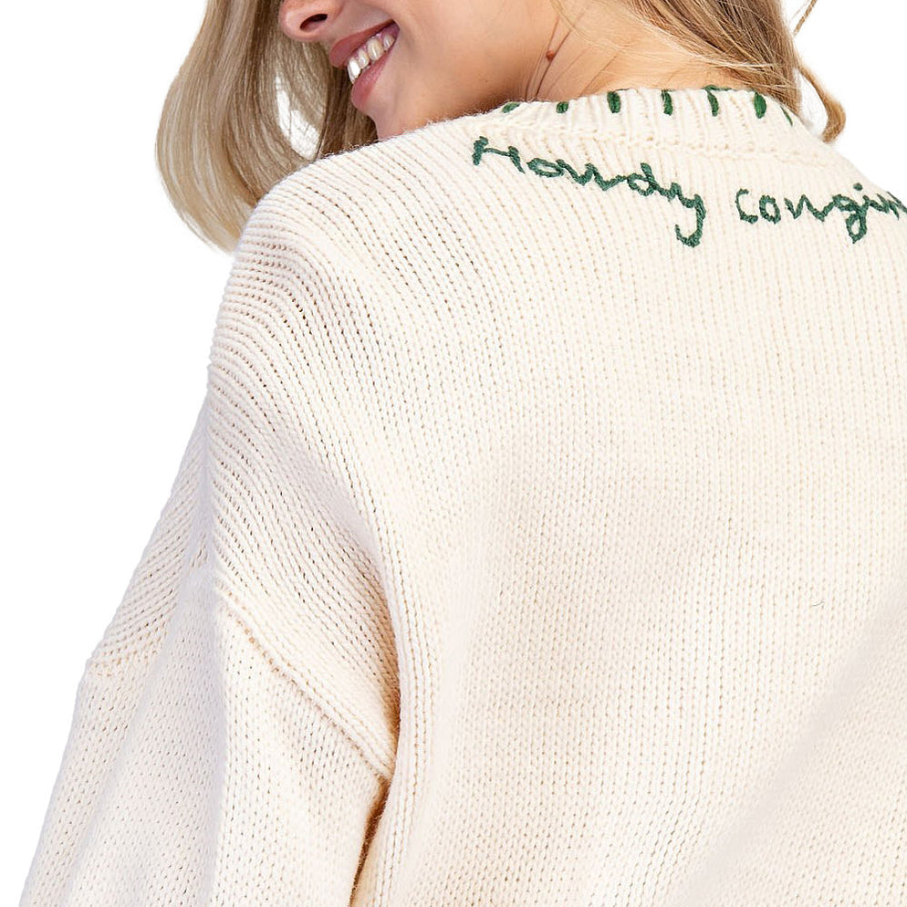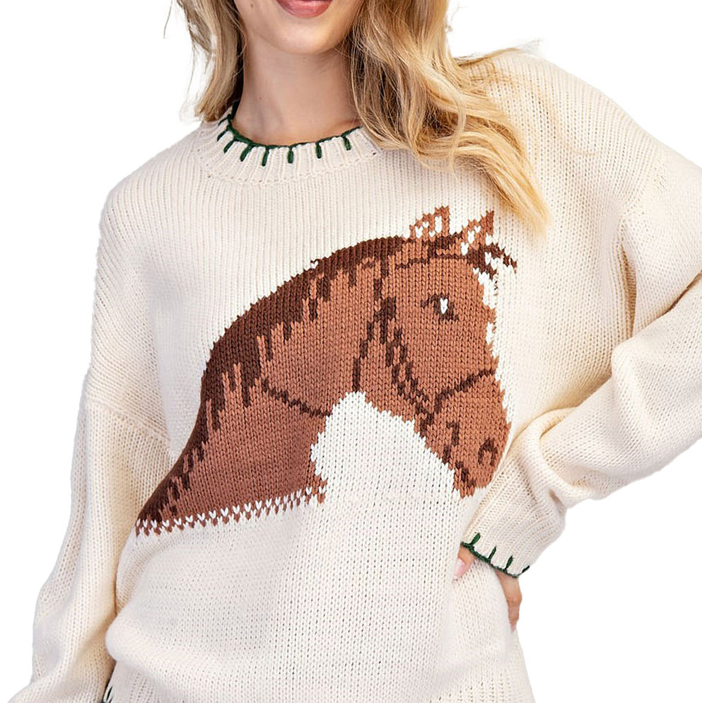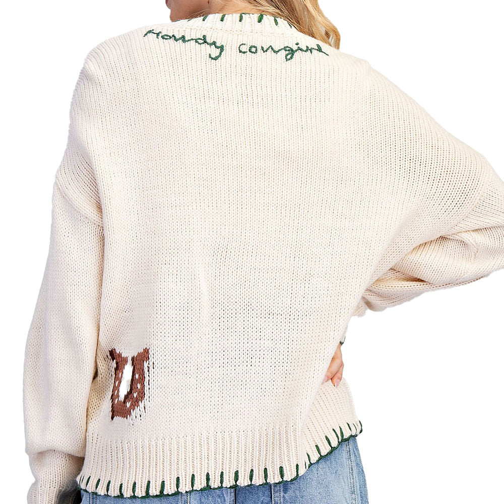 Saddle up in style with this charming knit sweater that brings Western flair to your wardrobe. Featuring a spirited horse graphic on the front and a lucky horseshoe on the back, it's finished with playful "Howdy Cowgirl" lettering at the nape. Contrasting stitching frames the collar and hems for an extra touch of character. Perfect for anyone who loves a little cowgirl attitude with their cozy comfort. 100% acrylic