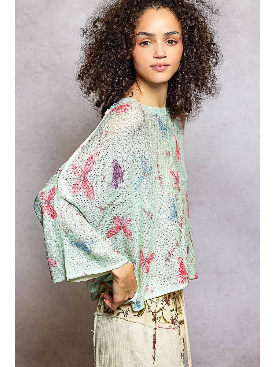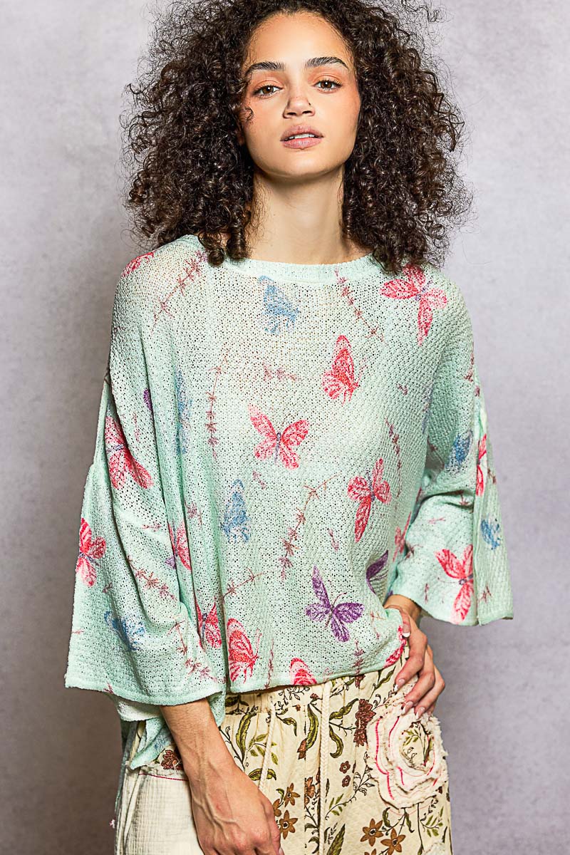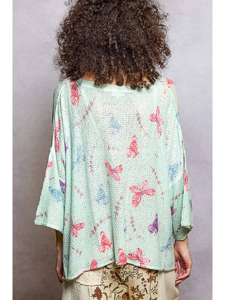 Flutter through your day in effortless style with this whimsical sweater top. Crafted from soft acrylic, it features a charming butterfly print that brings a touch of nature-inspired fun to your wardrobe. The relaxed fit and half sleeves offer all-day comfort, while the round neckline and ribbed neck band provide a polished finish. Rolling outseam edges add a subtle design detail that sets this piece apart.