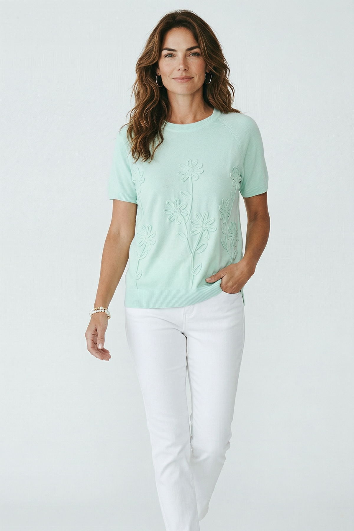 Refresh your spring wardrobe with this beautifully textured mint short sleeve sweater, designed to bring a soft, feminine touch to everyday dressing. Featuring delicate tonal floral appliqué across the front, this piece adds subtle dimension while maintaining an effortlessly polished look.