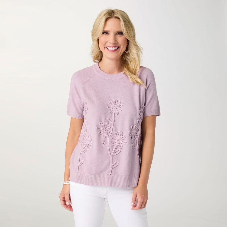 Floral Appliqué Short Sleeve Sweater | Lightweight Spring Knit Top