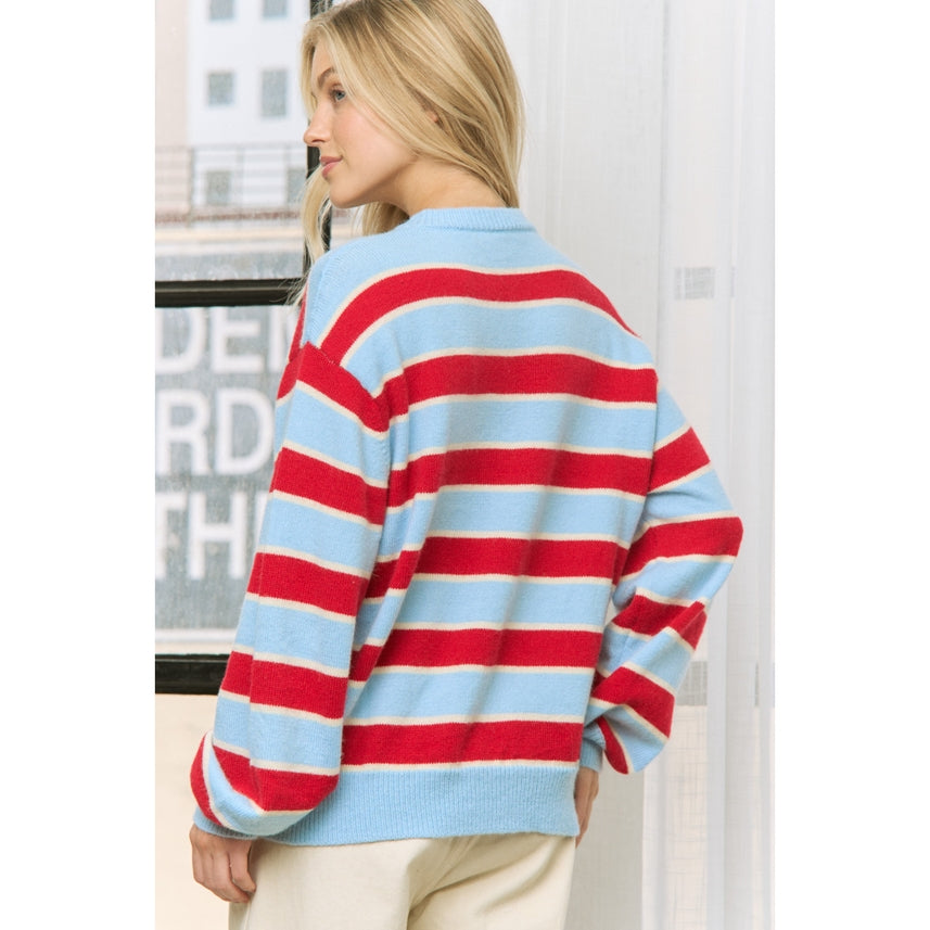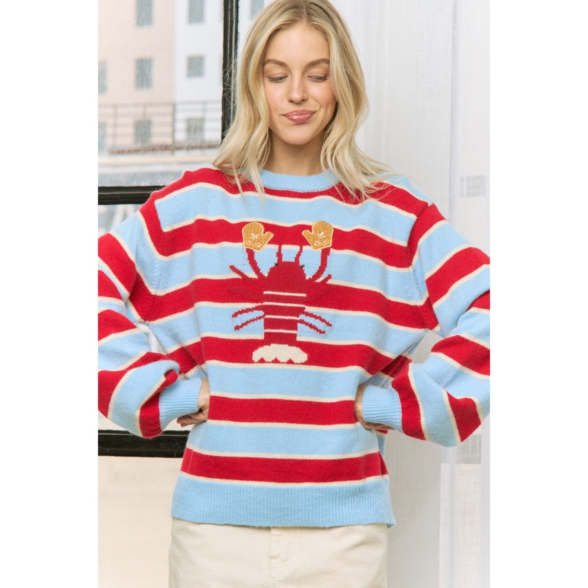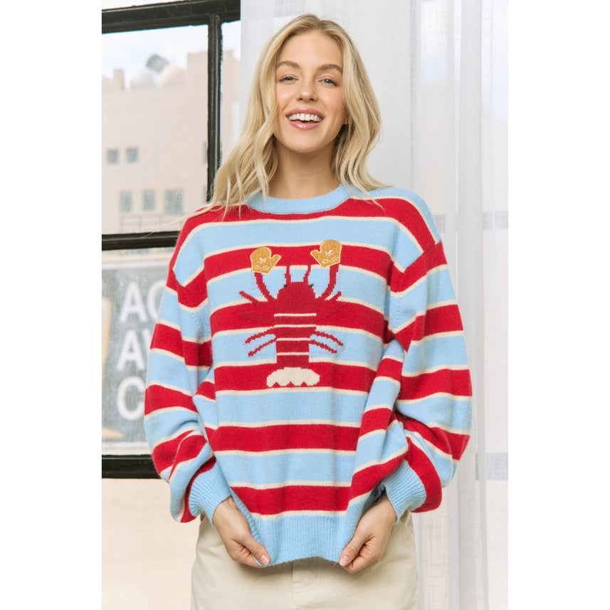 Wrap yourself in whimsy with this charming striped sweater that celebrates coastal vibes. The star of the show? A delightful lobster jacquard gracing the front center in all its adorable glory. Soft medium-weight knit keeps you snug without the bulk, while vibrant stripes add personality to every wear. The relaxed, comfortable silhouette pairs perfectly with a rounded neckline and ribbed trim along the sleeves, cuffs, and hem for a polished finish. Pure joy in sweater form!