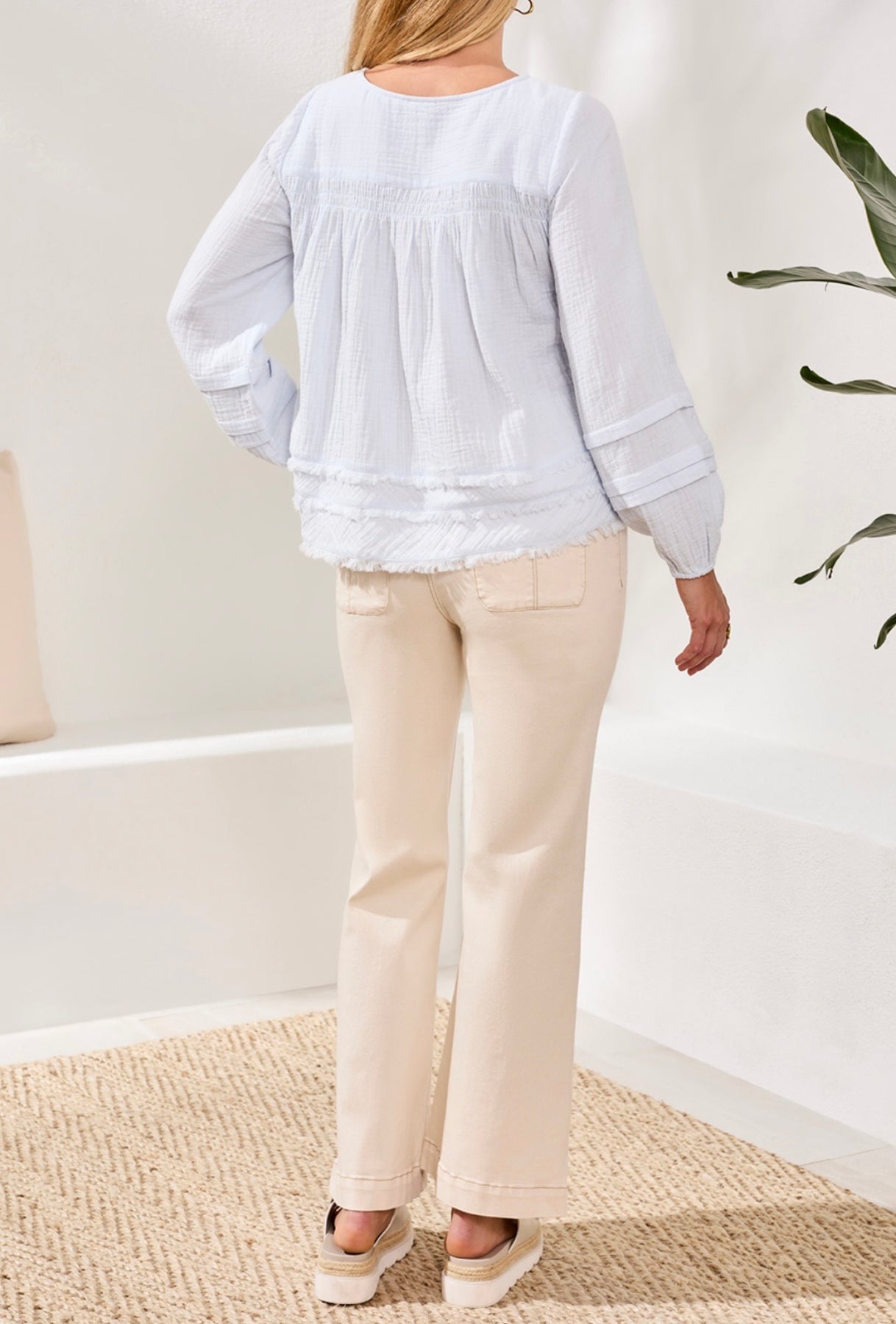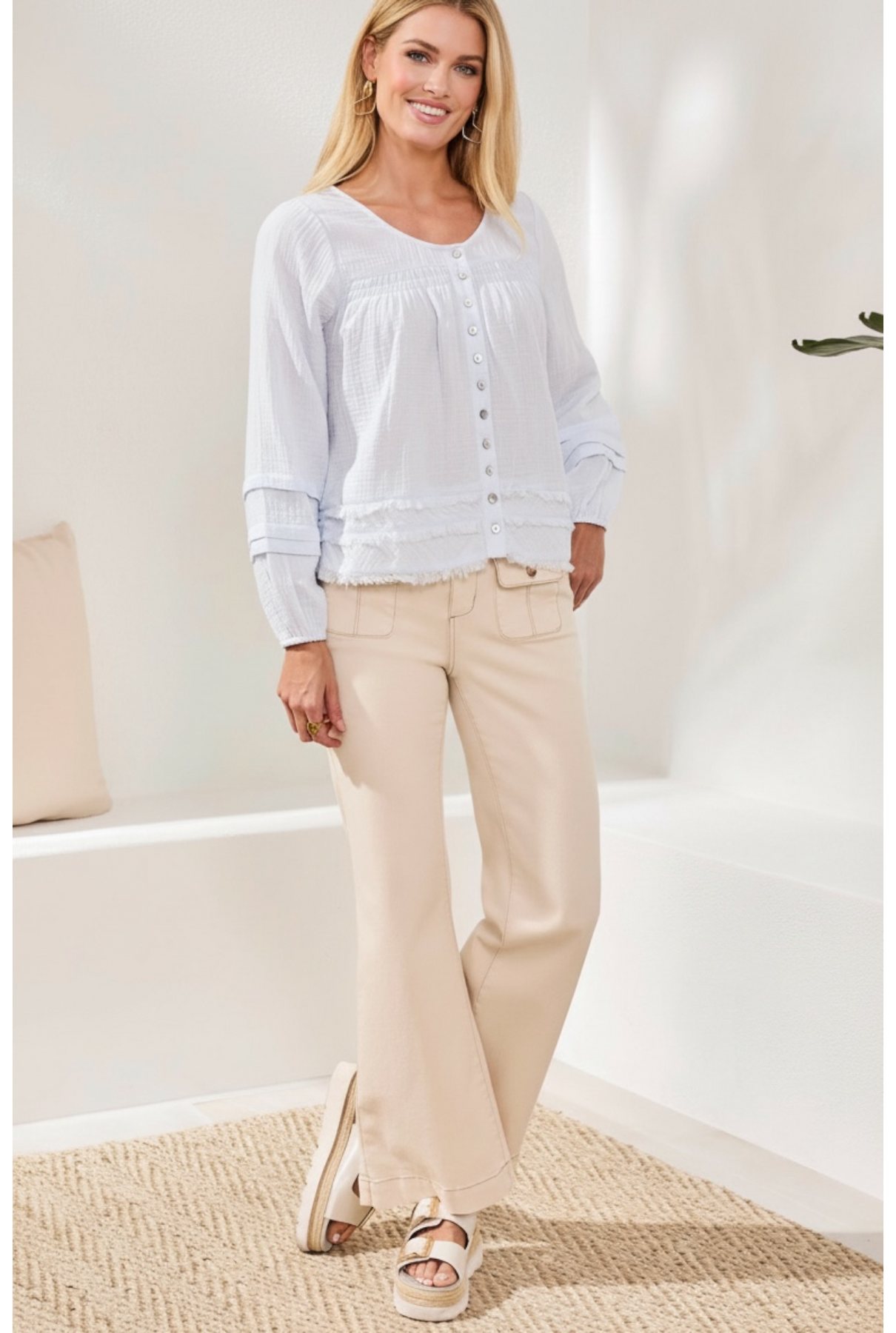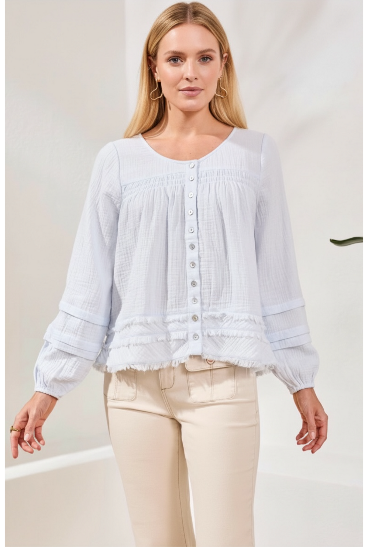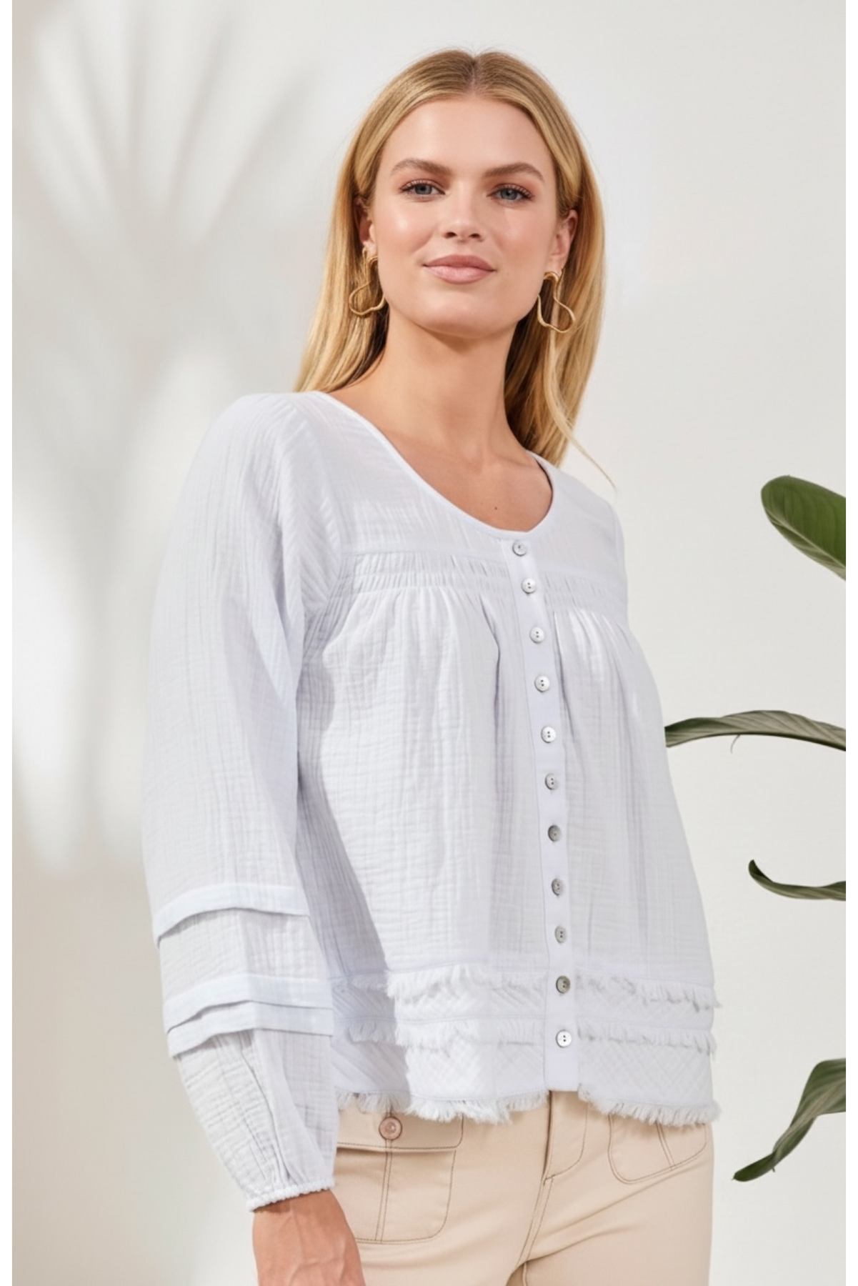 The button front gauze blouse offers classic long sleeves, a relaxed shape, and premium crinkled gauze for lightweight comfort. Designed for seasonless wear, this blouse features thoughtful details at the cuff and hem, making it an essential layer for casual chic style all season long.