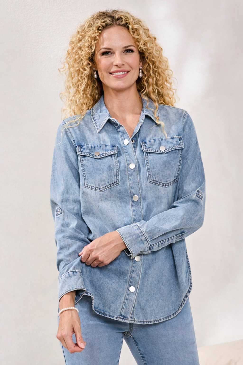 Must have! Classic jean shirt. This 100% cotton classic denim shirt has button front collar and roll up sleeves. Great with jeans, pants or skirts!