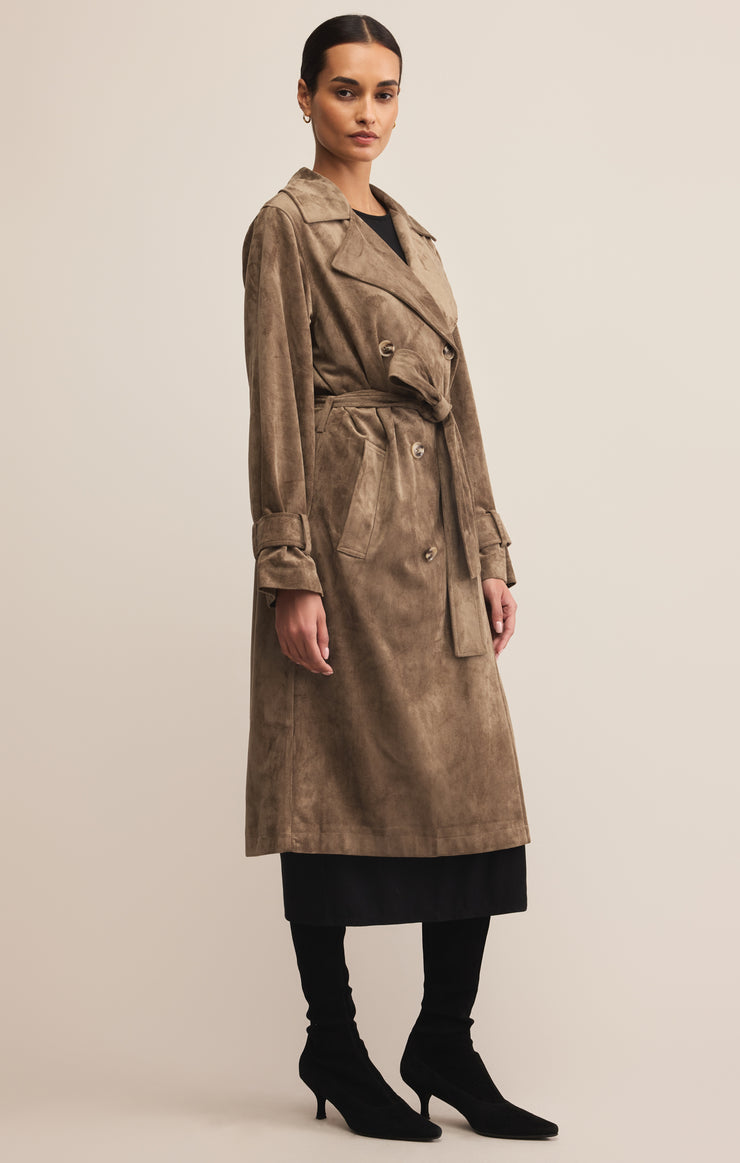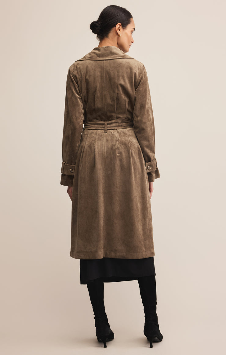 This midweight trench is all about quiet polish. Made from soft faux suede with welt pockets and a tie waist, it layers beautifully while keeping your look clean, styled, and season-ready.
