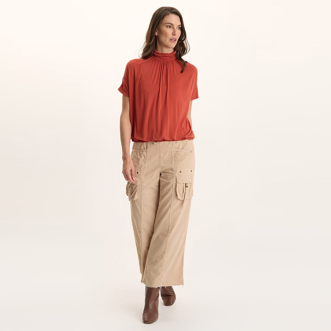 A wide-leg fit and raw-edge hem bring on the fun to this drawstring pull-on waist style. Layered cargo pockets and flapped tabbed pockets plus antique brass hardware round it all out.