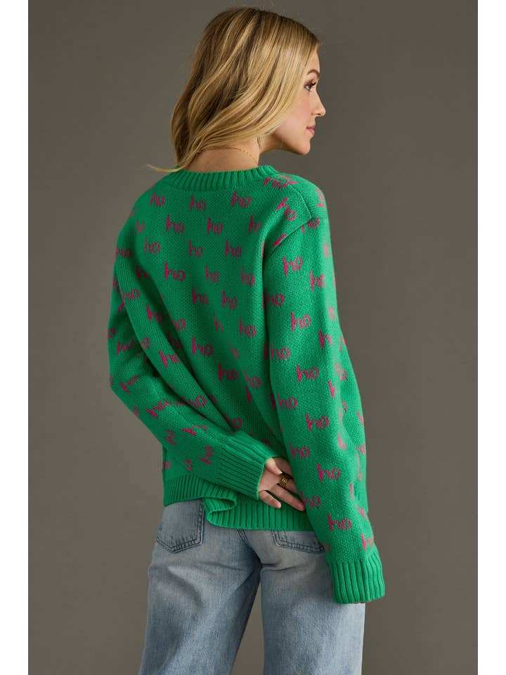 This playful green knit sweater features a cheerful pink "ho ho ho" on the front, perfect for spreading holiday joy. Crafted from 100% acrylic, it offers a cozy and soft feel to keep you comfortable during festive gatherings.