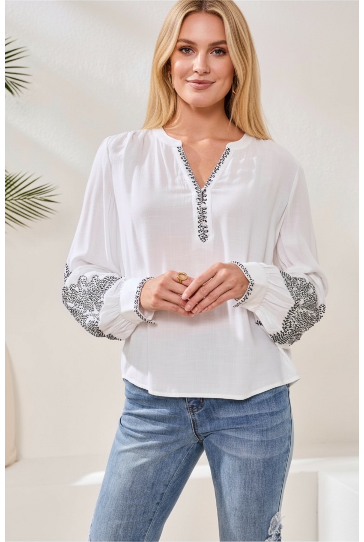 Elevate your wardrobe with this sophisticated blouse featuring intricate embroidered detailing that adds visual interest and refinement. Crafted from luxurious 100% viscose, the fabric drapes beautifully while maintaining breathability and comfort throughout the day. The timeless design transitions seamlessly from casual daytime wear to polished evening occasions, making it a versatile essential for any style-conscious wardrobe. Perfect for layering or wearing solo, this piece combines understated elegance with thoughtful craftsmanship.