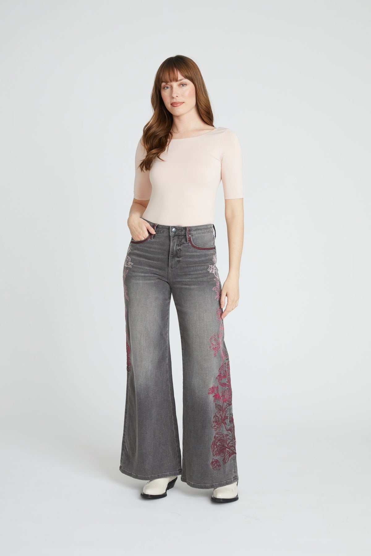 Our Mona Wide Leg in Blush Etched redefines effortless sophistication with a romantic twist. This style showcases intricate blush and rose-toned embroidery that gracefully trails down the leg — a beautiful fusion of soft femininity and modern edge. The subtle fading and tonal stitching create a perfectly broken-in look that feels timeless yet fresh. Designed in our signature stretch denim, Mona offers the ideal balance of comfort, shape, and style. Pair it with a fitted tee or embroidered blouse to complete your statement look.