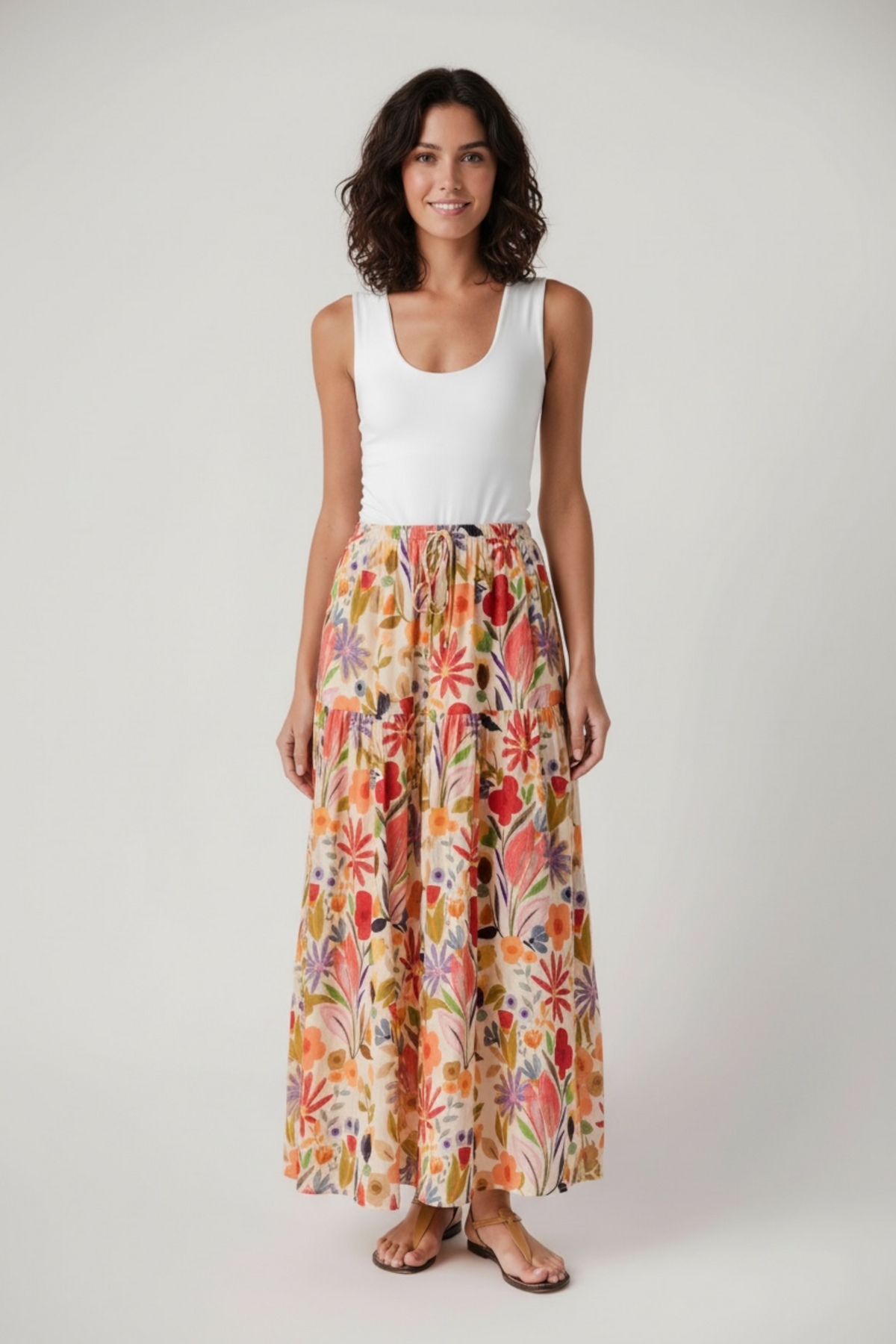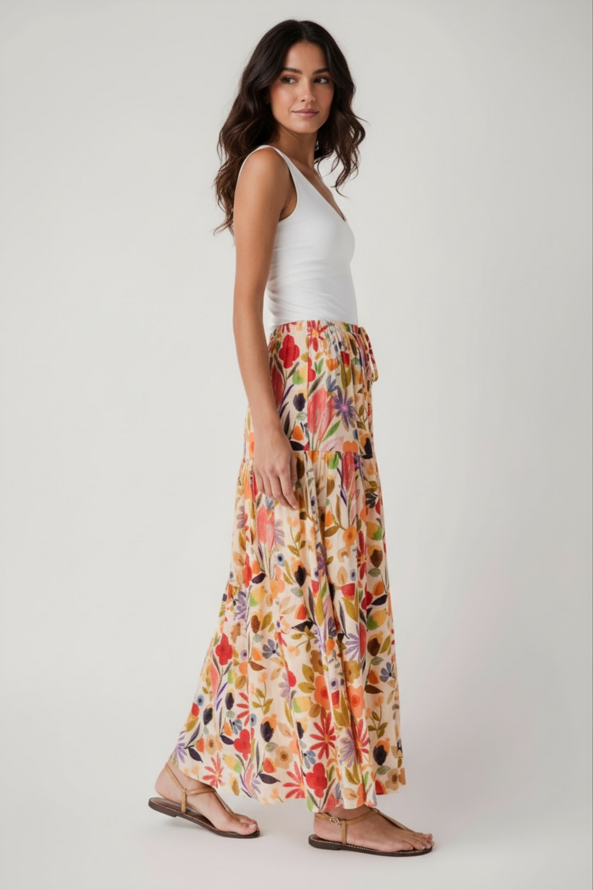 Twirl into paradise with the Palm Springs Skirt—your new go-to for effortless style. This breezy maxi combines a vibrant woven cotton-rayon floral print with an elastic waist and adjustable drawstring for the perfect fit every time. The luxe rayon lining glides smoothly, keeping you cool and comfortable from sunrise to sunset. Whether you're lounging poolside or dancing under the stars, this skirt delivers that carefree, vacation-ready energy.