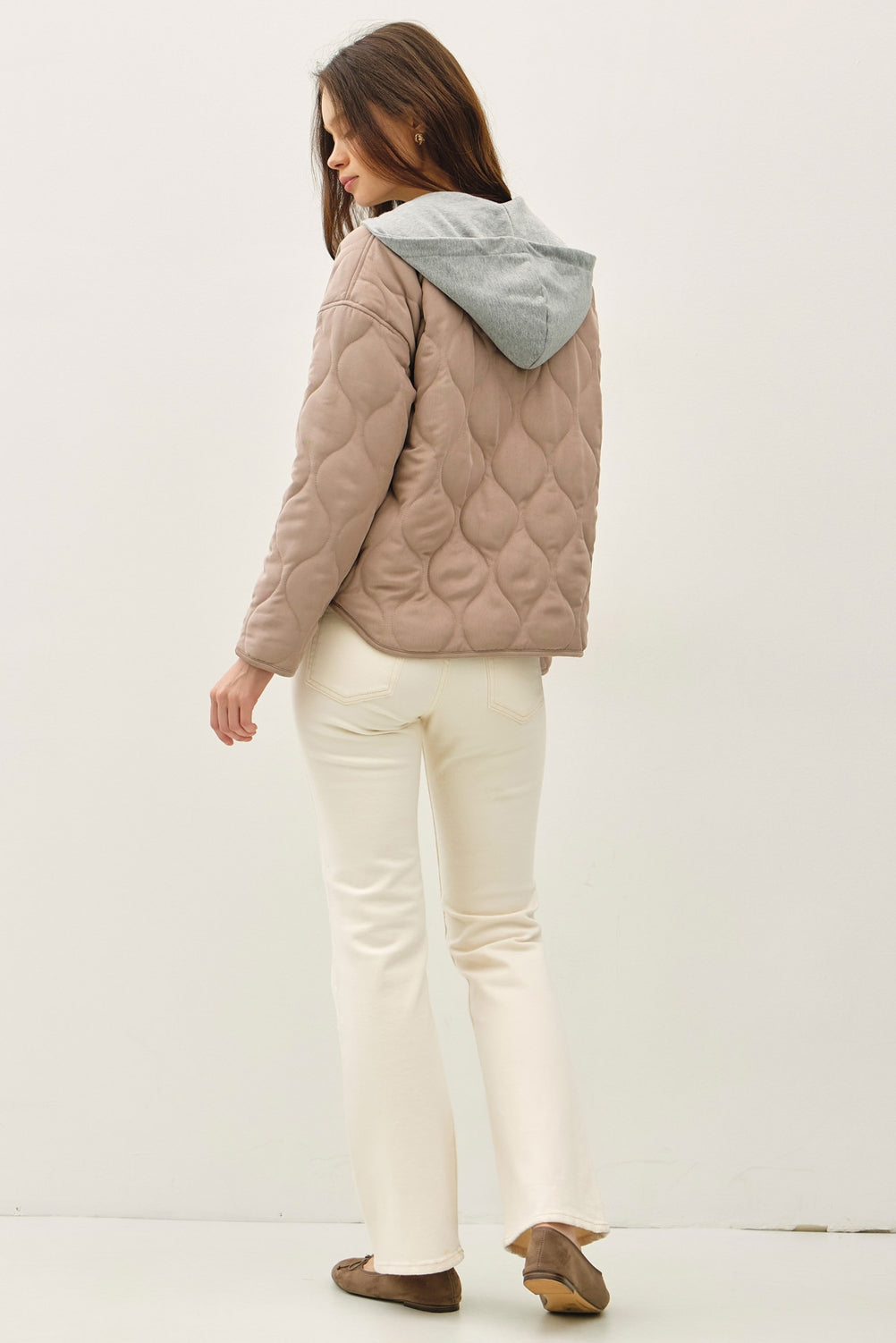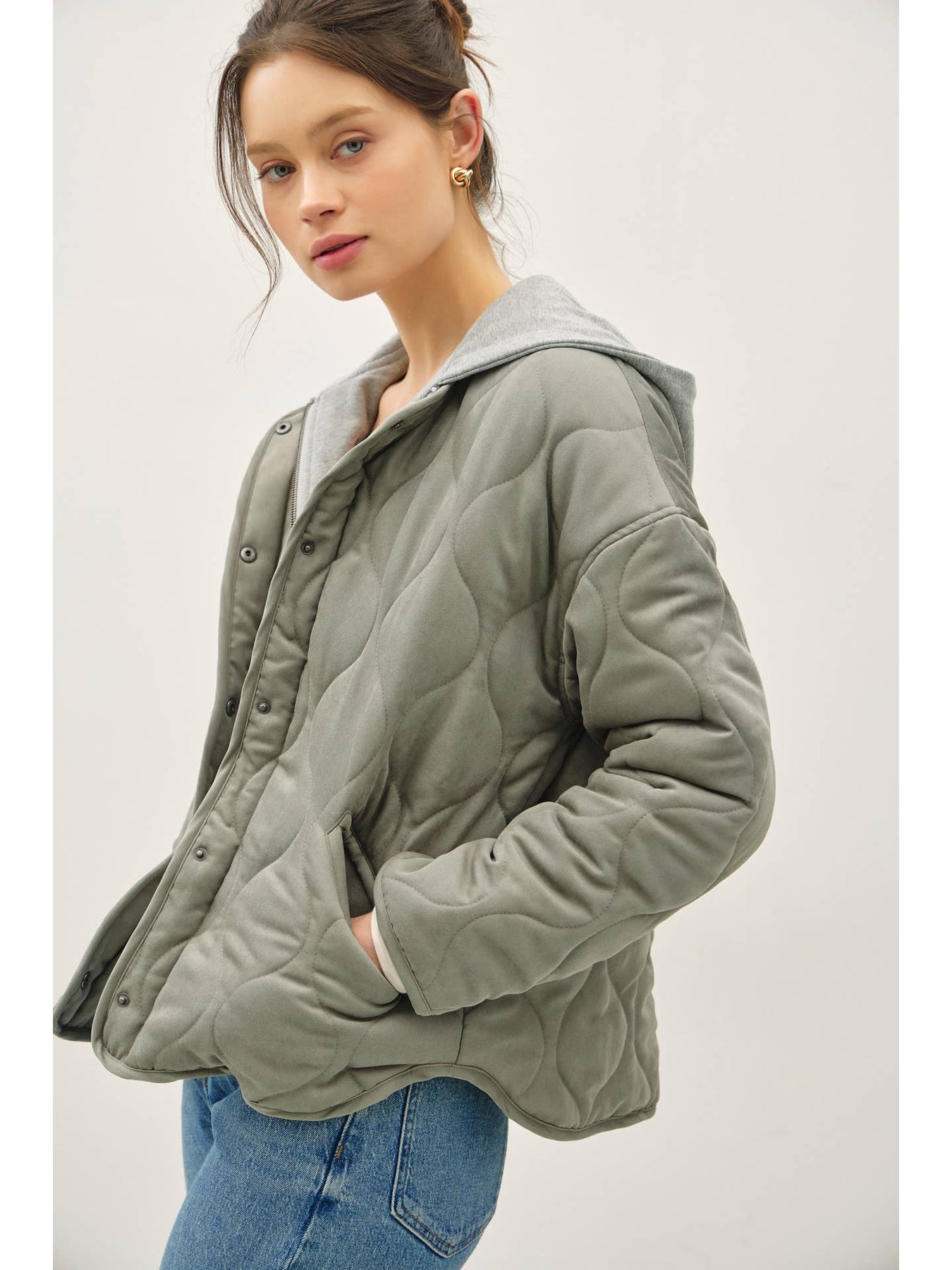 Stay cozy and stylish all season long with this playful quilted puffer jacket. Featuring a supple suede-like finish, it comes with a handy attachable hood and placket for extra warmth and versatility. The drop shoulder and long sleeves add a relaxed vibe, while front side pockets keep your hands toasty. Secure your look with a zipper front and snap button closure—your new fall and winter essential!