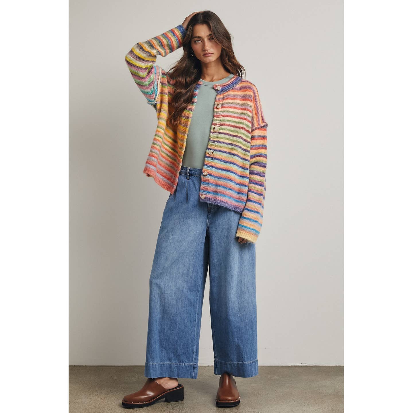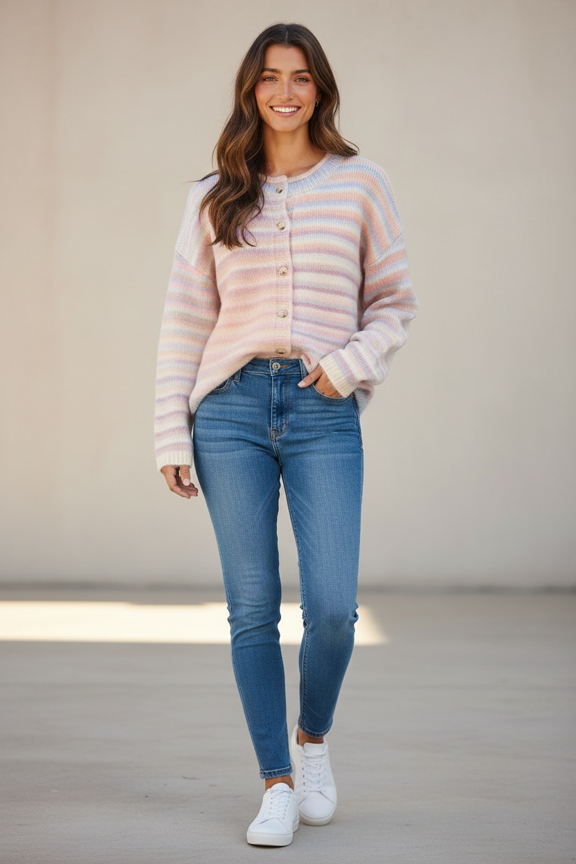 Bright, cheerful, and impossible not to smile at — this rainbow striped cardigan sweater brings playful color to everyday outfits. Featuring bold multicolor stripes and vibrant rainbow buttons, this cozy knit cardigan is designed to stand out while still feeling effortlessly wearable.